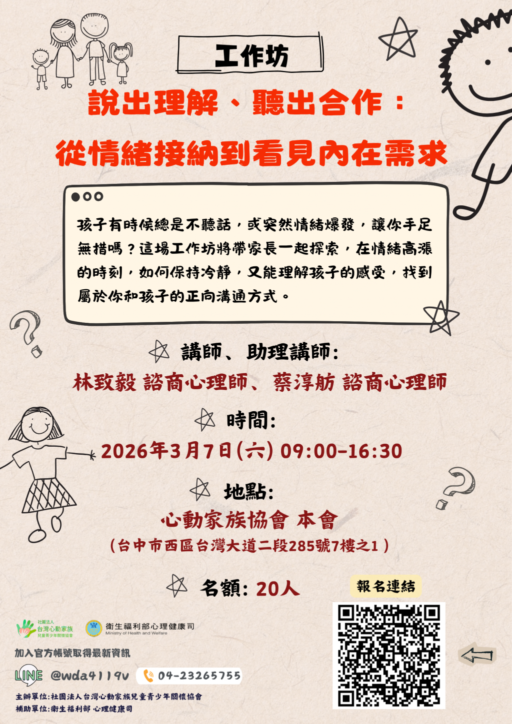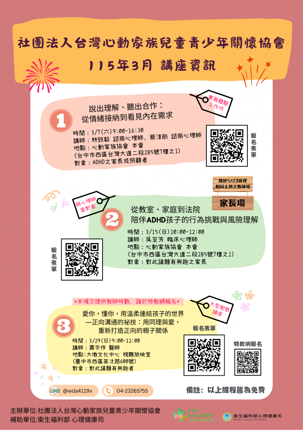 社團法人台灣心動家族兒童青少年關懷協會辦理「115年03月 ADHD 相關主題講座及工作坊」,鼓勵有興趣的家長、照顧者或教師報名參加。工作坊資訊如下: