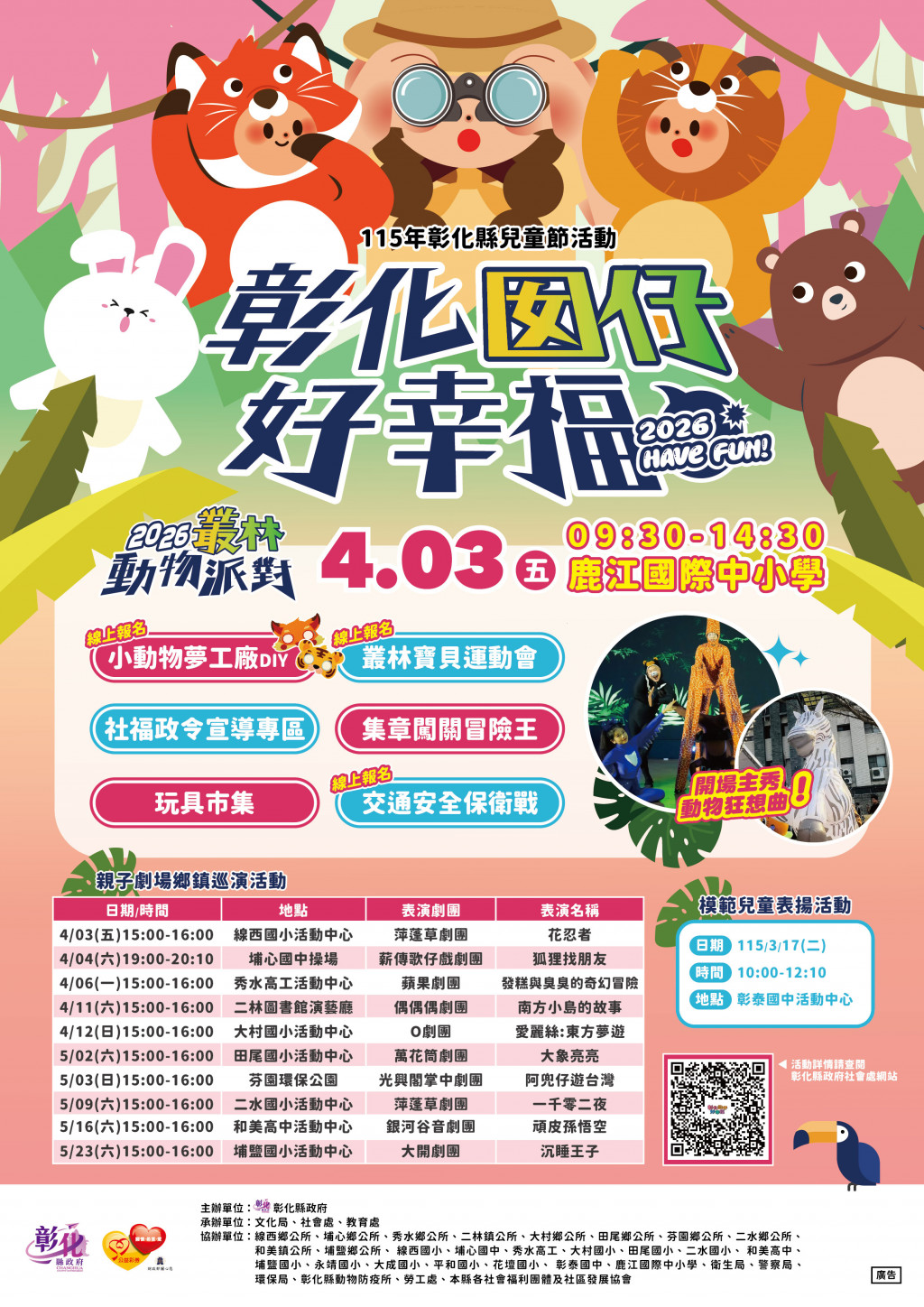 | 四、 | 活動訊息請至本府社會處網站/活動訊息專區/彰化囡仔好幸福~115年彰化縣兒童節活動「2026叢林動物派對」(網址:https://reurl.cc/ZZRY8a)參閱。 |