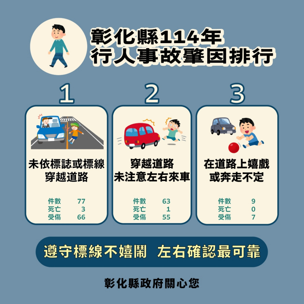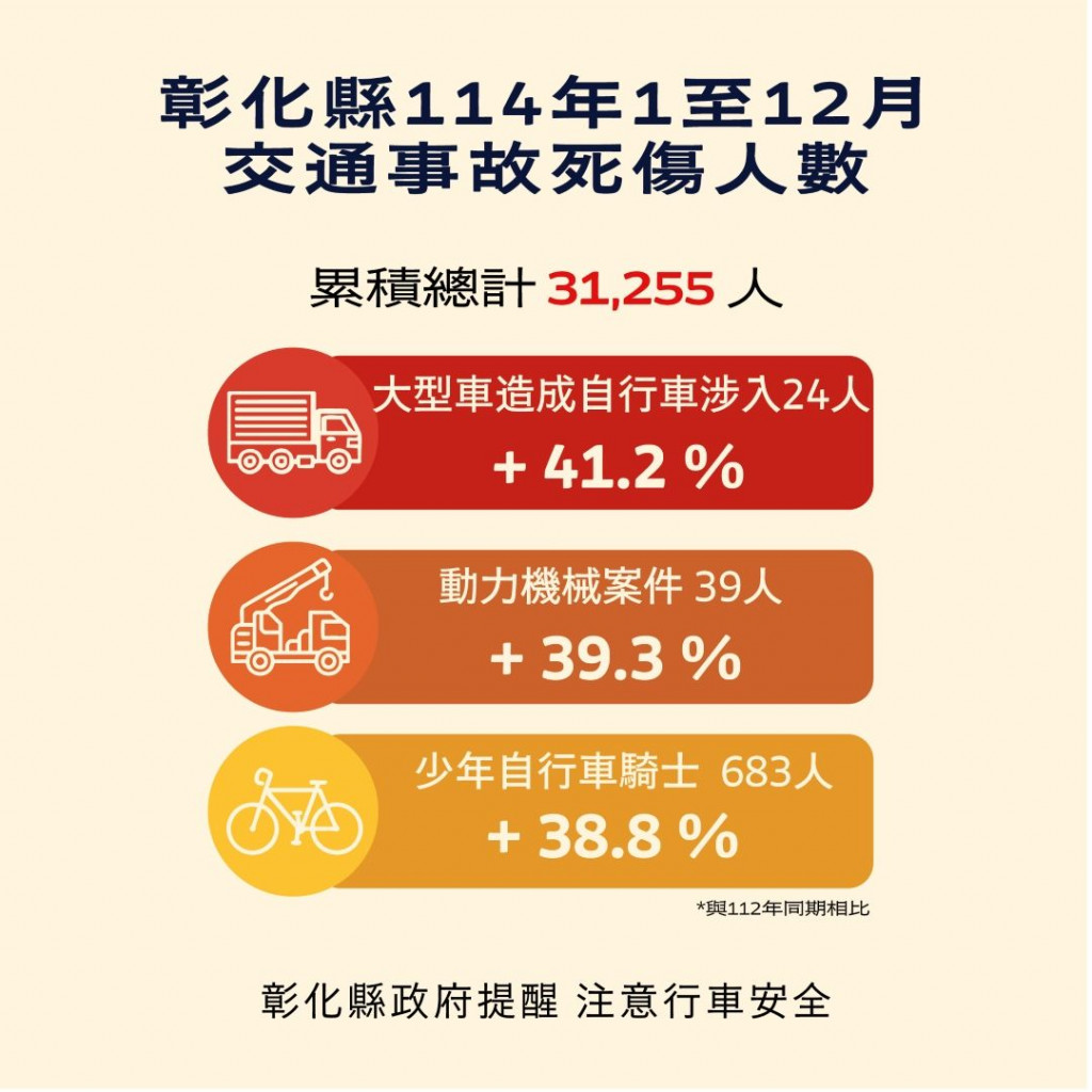四、附件為「114年1-12月彰化縣交通事故死傷人數增加排行、本縣各鄉鎮市30日死亡人數、各運具交通事故肇因及肇事熱點」共5份統計資料宣導圖。