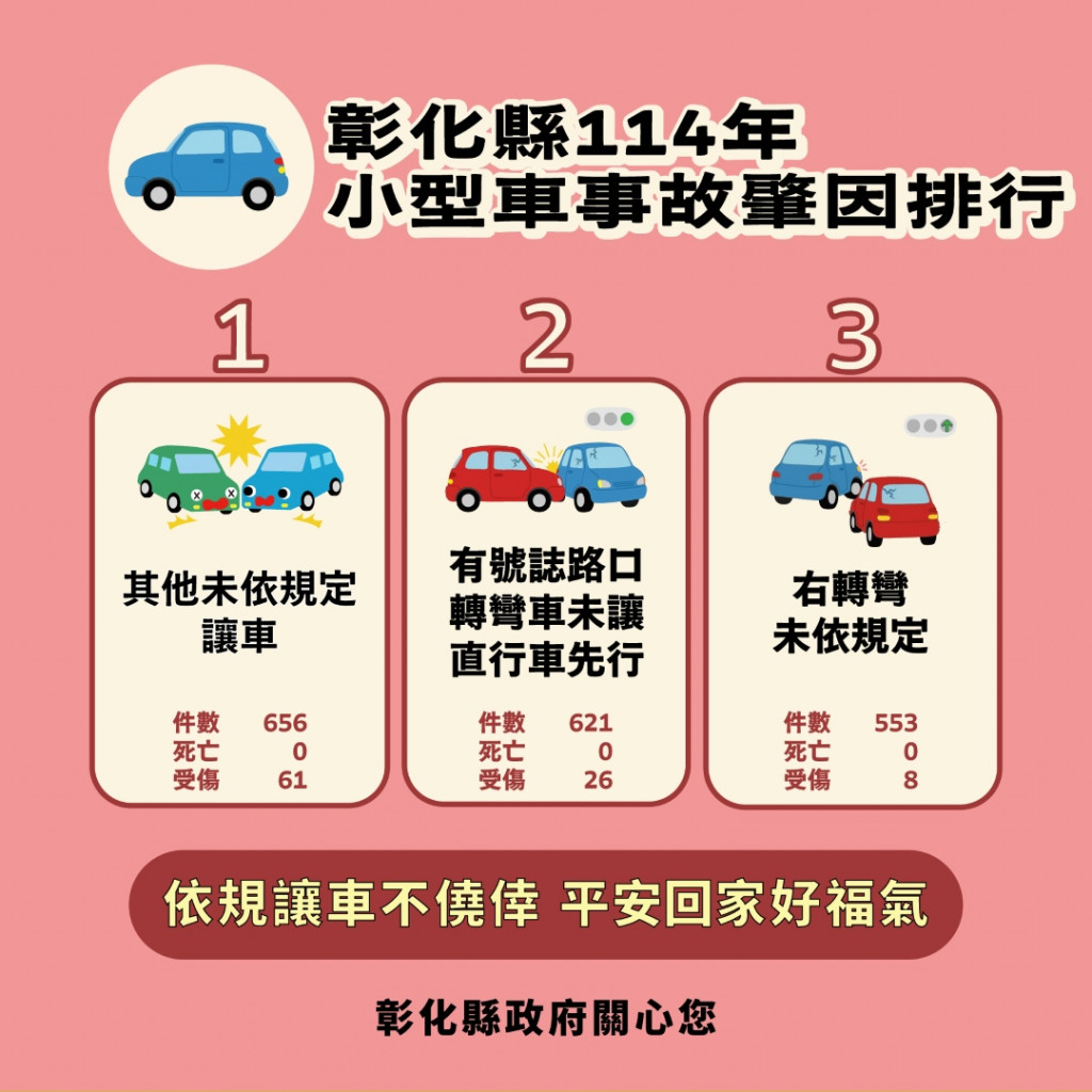 三、依據交通部道路安全資訊平台系統分析數據,114年彰化縣事故肇因排行: