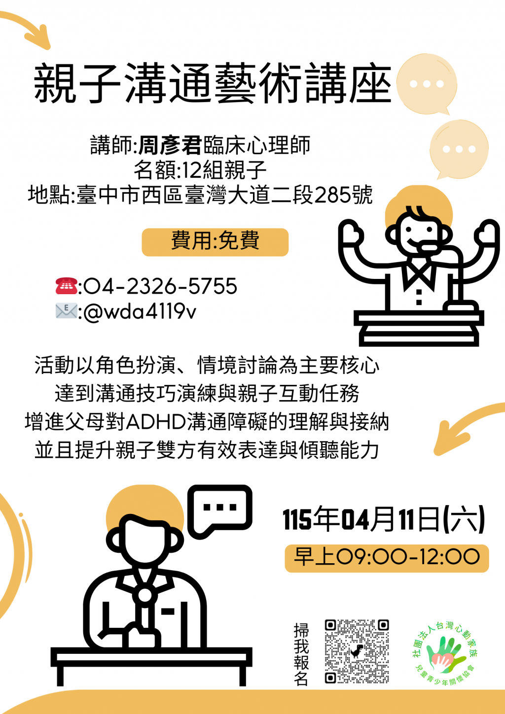 台灣心動家族兒童青少年關懷協會辦理「115年04月 ADHD 相關主題講座」,鼓勵有興趣的教師、輔導人員及對議題有興趣之家長踴躍報名參加。活動場次說明: